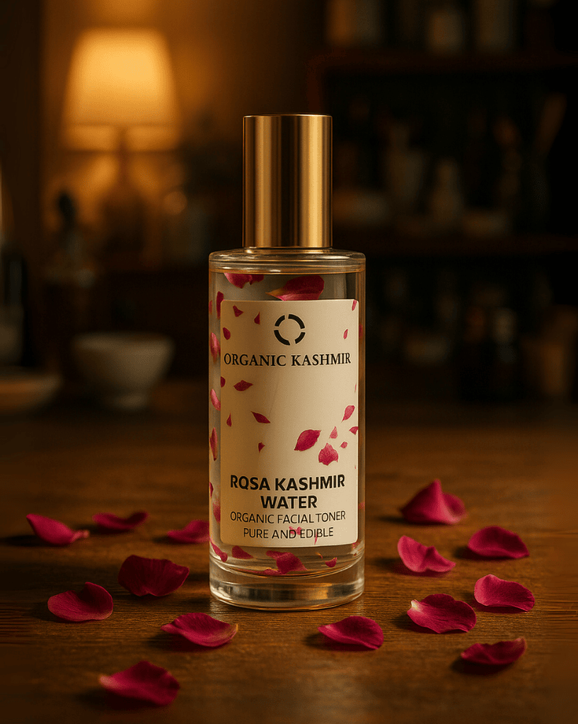 Organic Kashmir Koshur Rose Water is crafted from the finest handpicked organic rose petals sourced from Kashmir and distilled with fresh Himalayan spring water.